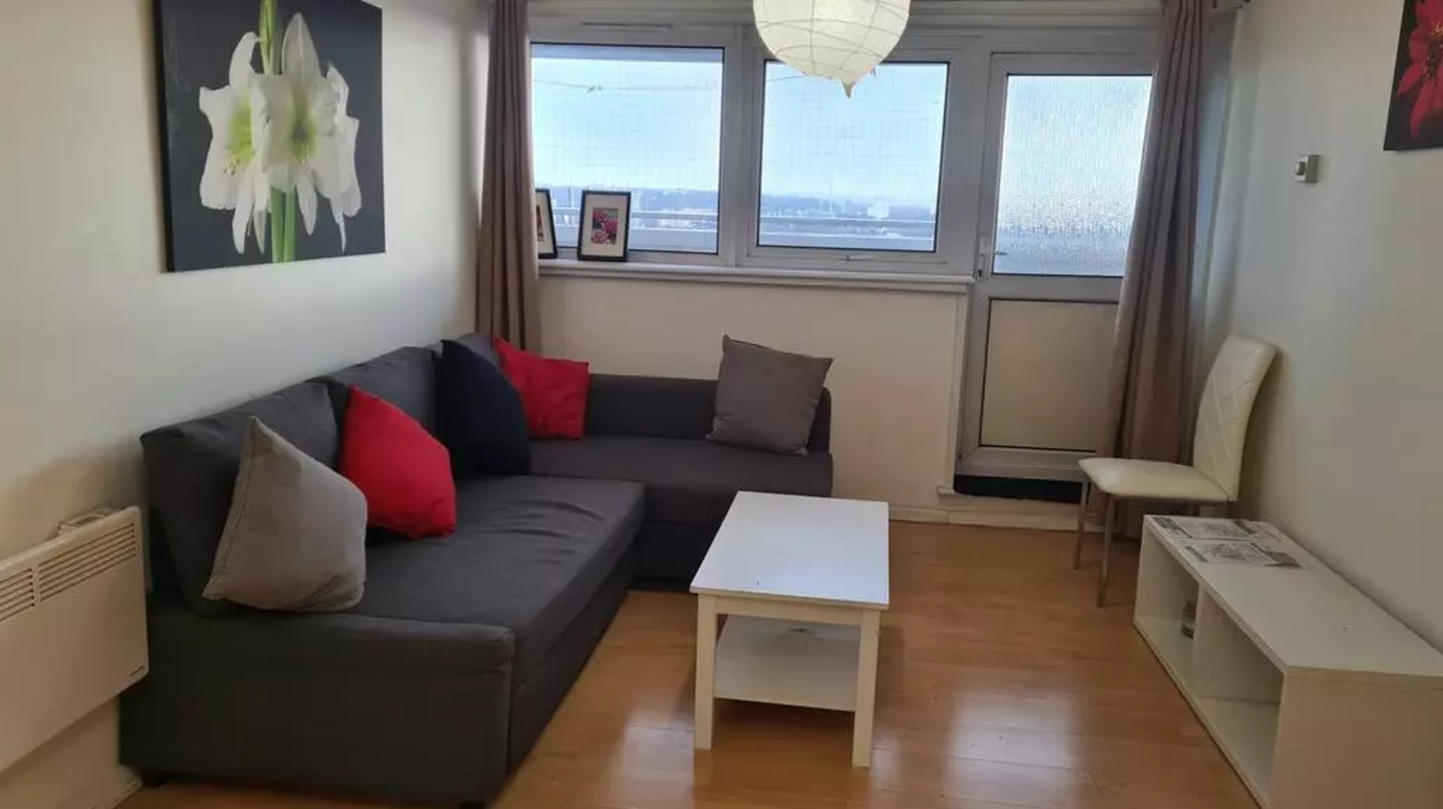 Double glazed window, electric heater, carpeted flooring and ceiling light.