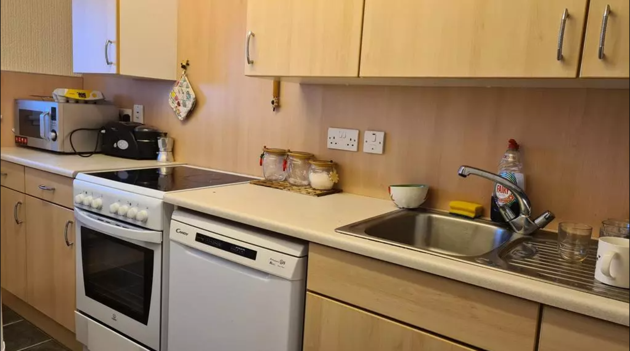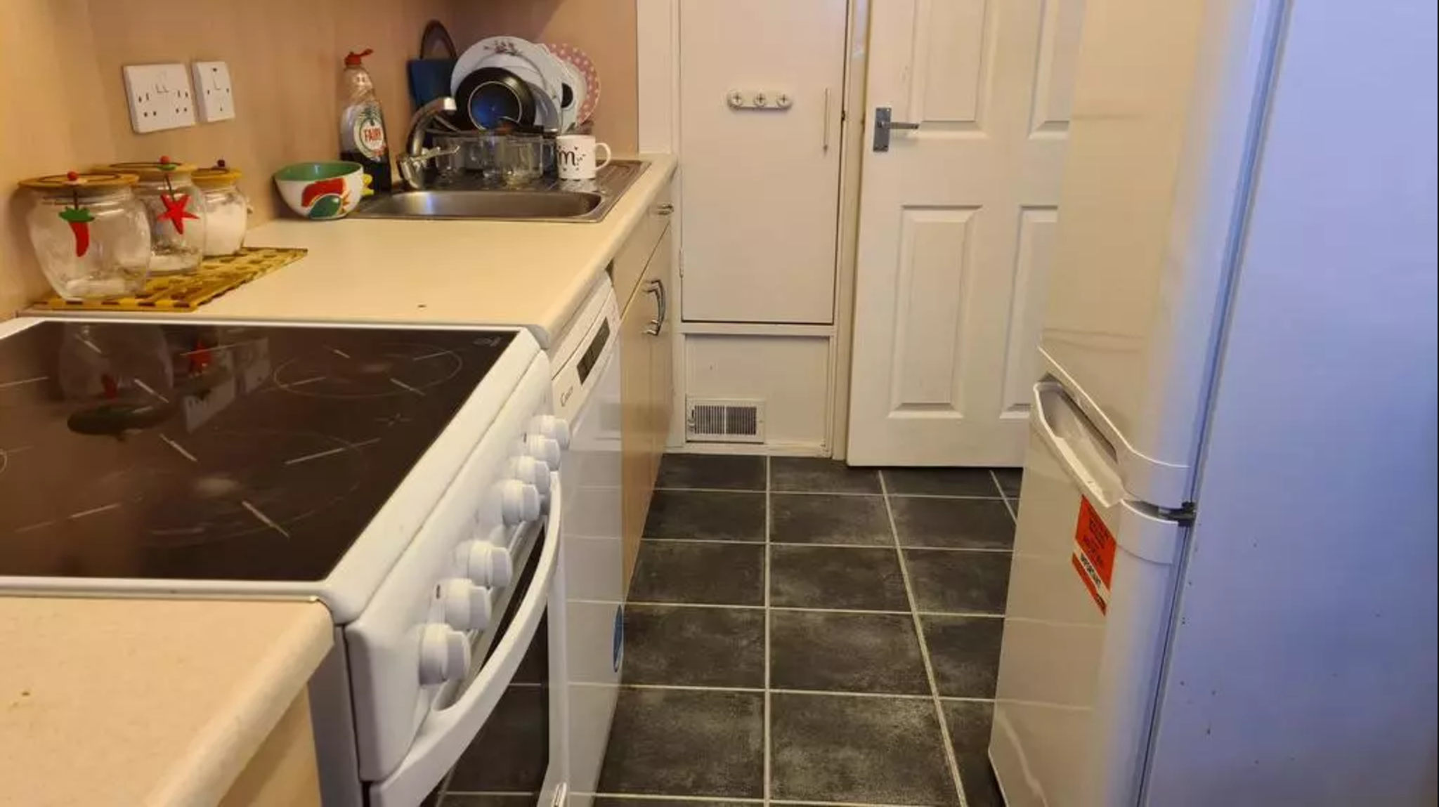 Fitted work surface, built-in wall and base units, stainless steel sink with drainer,electric oven with hob. Double glazed window, electric heater and ceiling light.